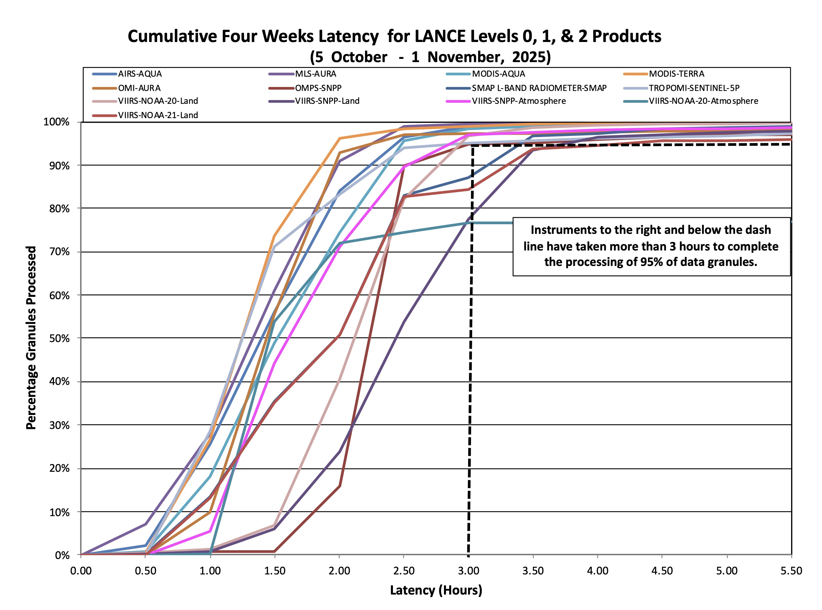 Over the last 4 weeks, over 95% of NRT data requests for all instruments except for 6 instruments (SMAP L-BAND RADIOMETER-SMAP, VIIRS-SNPP-Land, VIIRS-NOAA-20-Atmosphere, and VIIRS-NOAA-21-Land) were satisfied within 3 hours. OMPS-SNPP, SMAP L-BAND RADIOMETER-SMAP, VIIRS-SNPP-Land, VIIRS-NOAA-20-Atmosphere, and VIIRS-NOAA-21-Land over 87%, 78%, 77%, and 84% of the NRT data requests were satisfied within 3 hours, respectively.