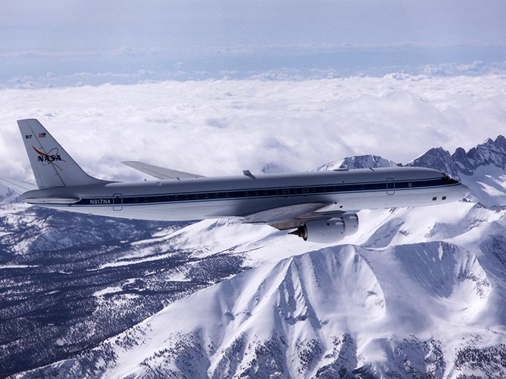 The NASA DC-8 is a Douglas DC-8 jetliner that has been modified to support NASA’s Airborne Science objectives. The DC-8 has a maximum flight duration of 12 hours and can operate up to an altitude of 42,000 ft. It can support a payload of up to 30,000 lbs and can seat up to 45 researchers and flight crew members.