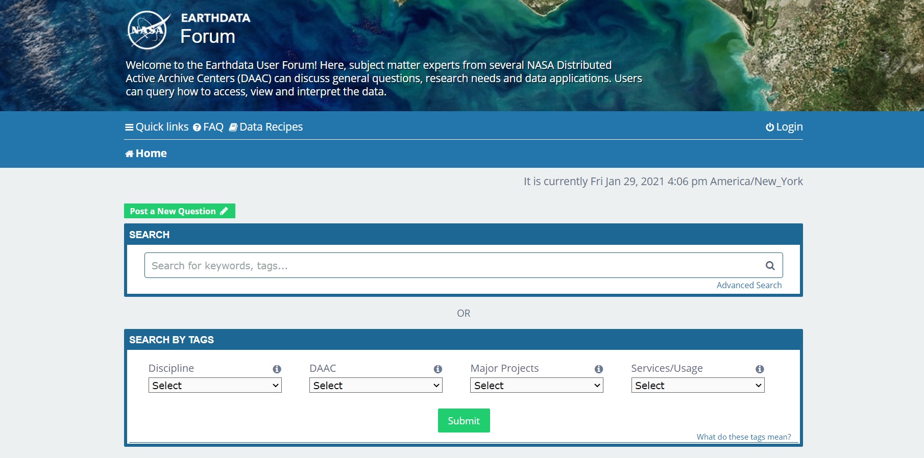 NASA's Earthdata Forum is a hub that connects Earth science data users and experts in the field in discussion about how to discover, analyze, and use data across all Earth science disciplines. Our field of experts includes representatives from NASA's Distributed Active Archive Centers (DAACs).