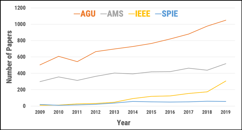 Fig. 1. The yearly number of Earth science papers from major publishers that discuss or use supervised machine learning. AMS = American Meteorological Society, IEEE = Institute of Electrical and Electronics Engineers, SPIE = International Society for Optics and Photonics. Credit: Katrina Virts and Rahul Ramachandran
