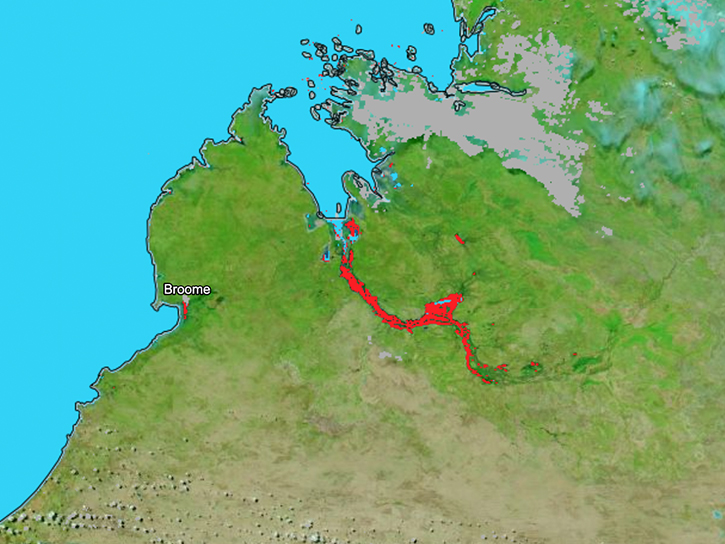 Image of flooding in a river flood plain in northwestern Australia as highlighted by the Flood 3-Day Window layer in red. Visit Worldview to interact with the layers: https://go.nasa.gov/2Qm9dq7