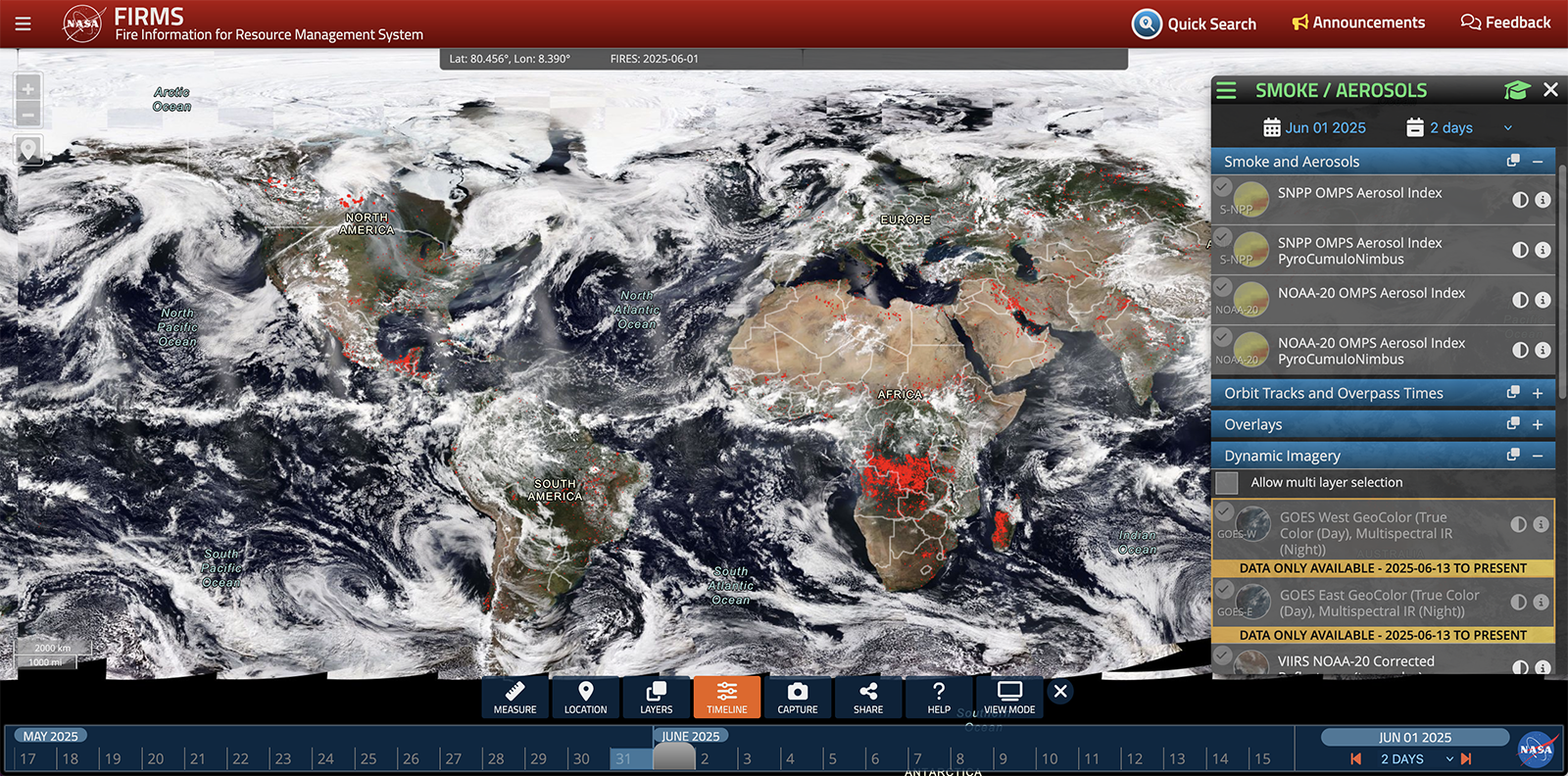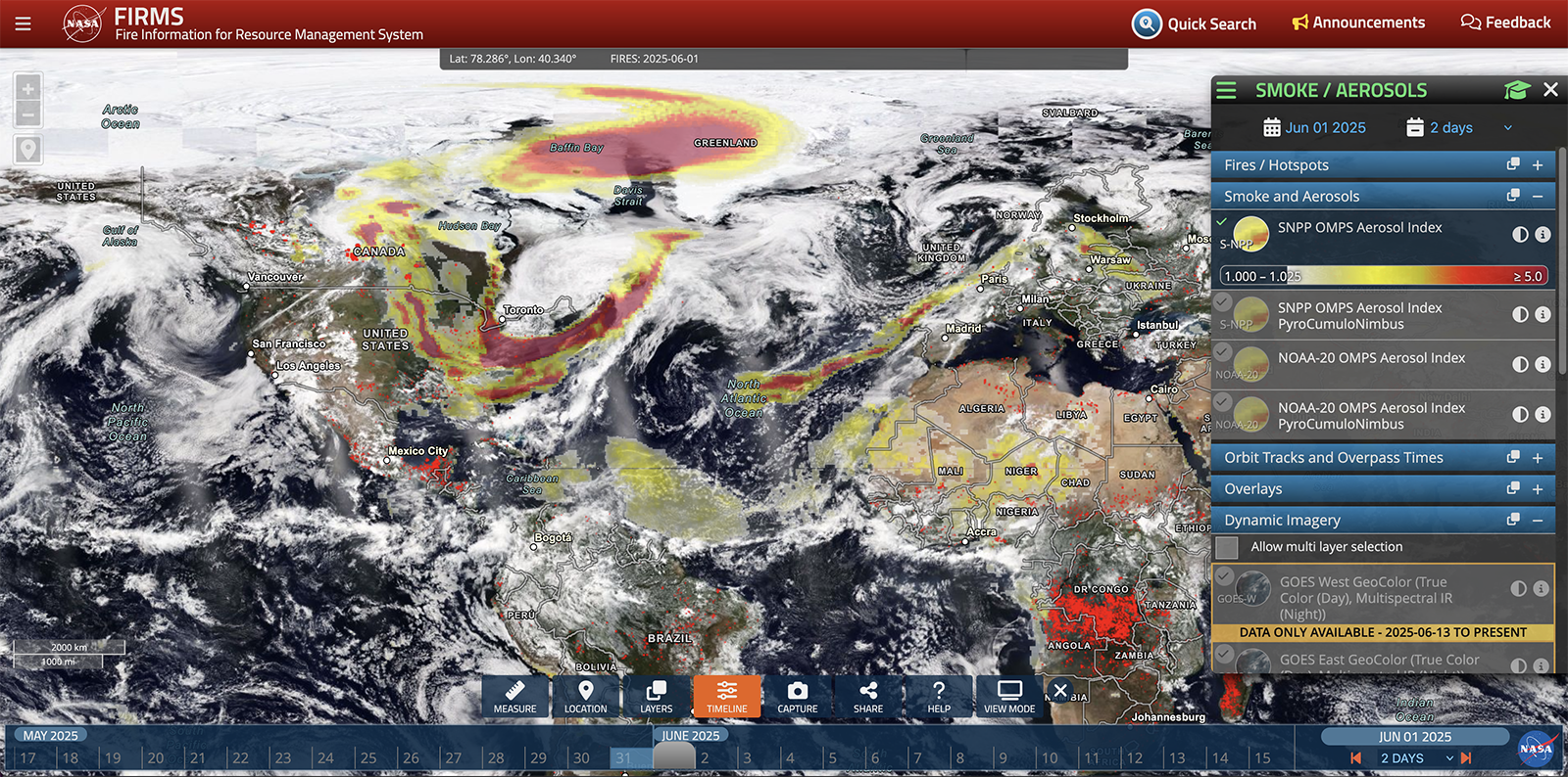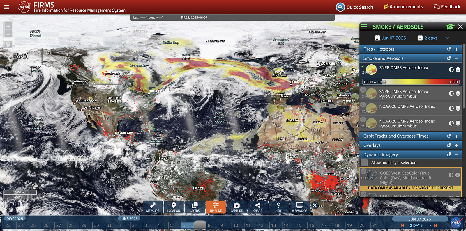 The Fire Information for Resource Management System (FIRMS) Smoke/Aerosols mode (in both FIRMS Global and FIRMS US/Canada) can be useful for helping determine where the smoke is coming from. In this blog post, which is an update of one we published in 2021, we focus on smoke plumes from the recent Canadian wildland fires, highlighting how FIRMS can be used to track the spread of smoke plumes.