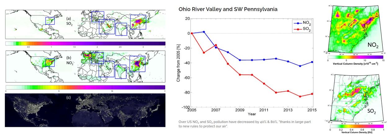 Fortunately, the presence of ozone and other trace (small percentage) gasses in the atmosphere, including pollutants such as nitrogen dioxide (NO2) and sulfur dioxide (SO2), can be detected by their unique spectral signatures. This is precisely what the Ozone Monitoring Instrument (OMI) aboard NASA's Aura satellite was created to do.